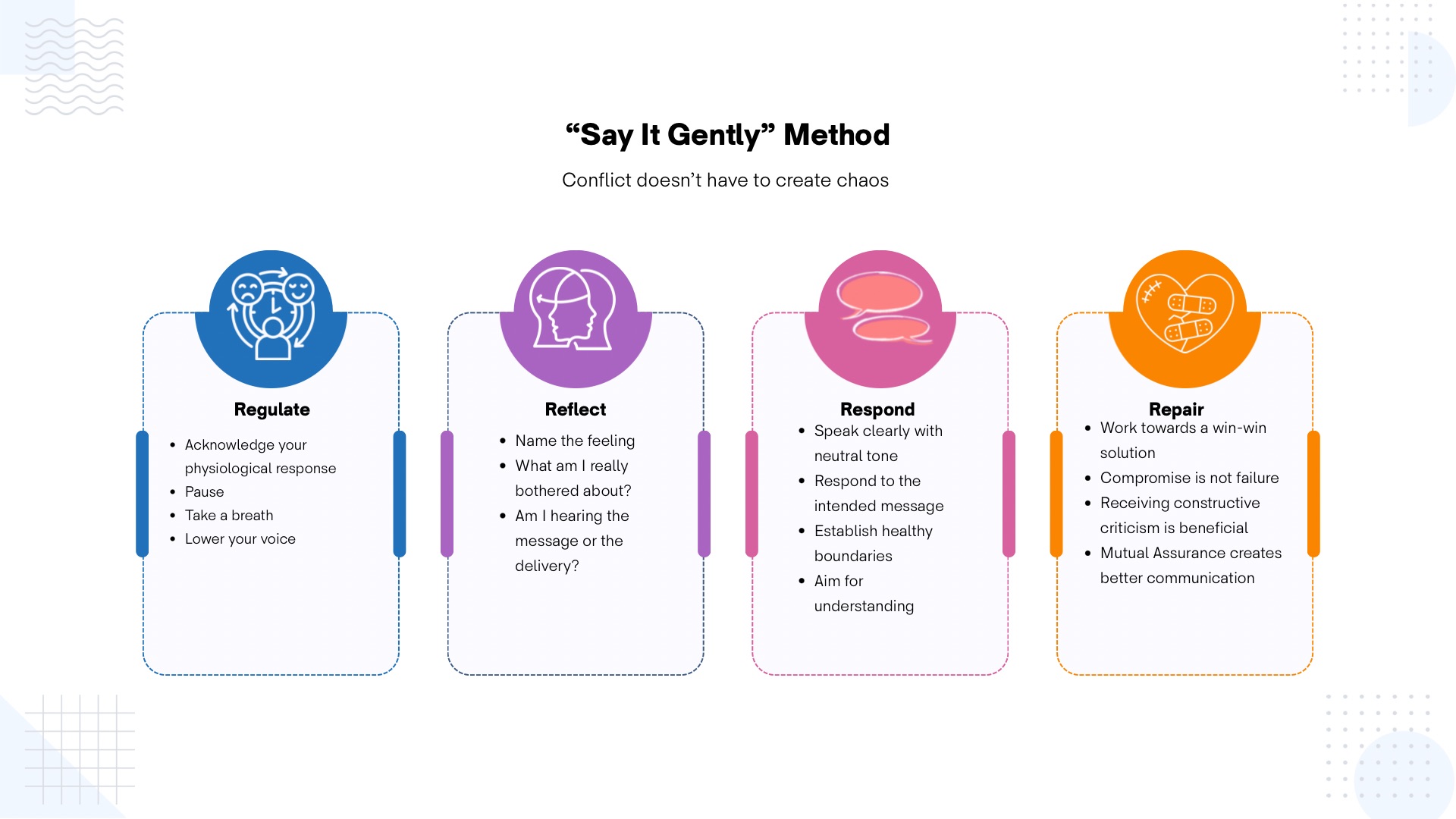 Regulate → Reflect → Respond → Repair/Exit.